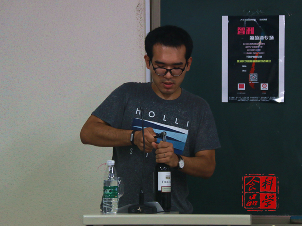 毕业于西北农林科技大学葡萄酒学院的张腾学长首先从葡萄酒的历史开始,向同学们介绍了葡萄酒的礼仪,侍酒与品酒等相关知识,通过学长的讲解,同学们对葡萄酒有了初步的了解。在接下来的演讲过程中,葡协的干事们为在场的众人依次倒上的“长相思”、“美了”、“赤霞珠”、“茜拉”将酒会送入了高潮。张腾学长带领着同学们进行了品酒:观色、闻香、品尝、总结这四个步骤。这四款酒均产自智利,张腾学长为大家讲述了有关于智利葡萄酒产区的基本概况,让同学们受益匪浅。品尝美酒的同时张腾学长又介绍了选酒所依循的环节,只有选对了酒才更能品尝出葡萄酒的魅力。