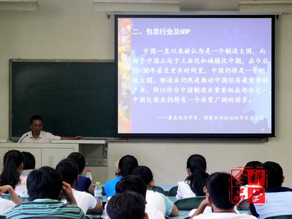 总后勤部军需研究所研究员何锦风大校应邀为包装工程专业的新生做专业教育。在何锦风大校对包装专业的分析中不难看出,国家对食品包装行业十分重视,近年来有了飞速的发展,目前包装行业已经是制造业中的龙头,包装行业未来的发展更是不可限量。何大校鼓舞学生们,一定要好好学习,成为包装行业未来的开拓者,实现自己的人生价值。