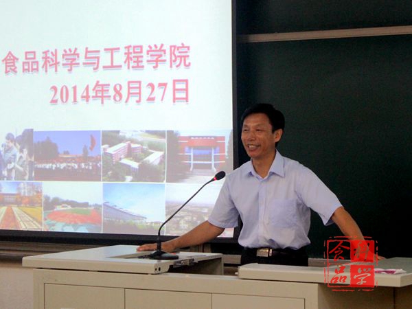 会上,仝其根院长为同学们做报告。仝院长就学院的整体情况从学院发展历史、教学科研团队,科研成果转化,社会服务等方面向同学们进行介绍。几张简短的PPT显示了学院近几年的快速发展和雄厚的师资力量。尽管就业离新生还比较远,但为了让同学们更早树立起大学的奋斗目标,仝院长向大家介绍了学院毕业生的就业情况,食品行业发展现状,“3+1”教学模式等,他向新生提出了五点要求,即适应学习方式的转变、适应生活环境的改变、树立安全意识、处理好能力锻炼与专业学习的关系、利用好大学开放的学习资源。他用一个个发生在身边的事例,增强了同学们的对本专业的自信心。
