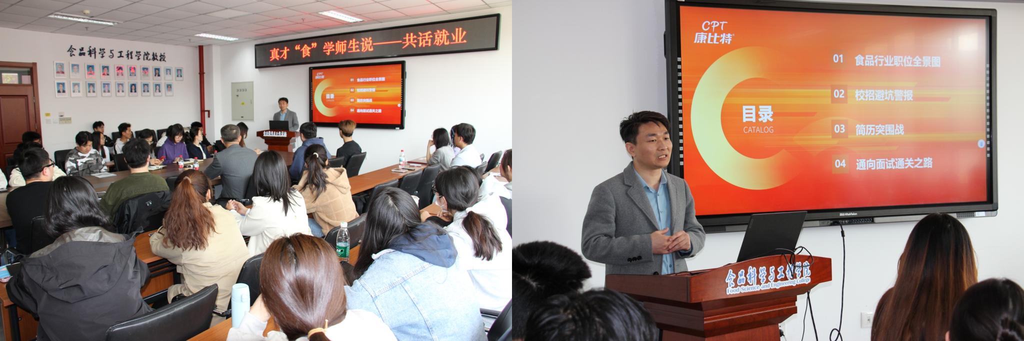 活动邀请康比特公司人力资源总监唐立安、招聘经理胥万幸分享食品行业职业发展与求职攻略。胥万幸围绕食品行业职位、校招要求、简历优化及面试技巧展开讲解,强调简历逻辑清晰且要与岗位高度适配,结合实例介绍STAR - R模型写简历的方法,并重点分享结构化面试和无领导小组讨论技巧,同学们收获满满。