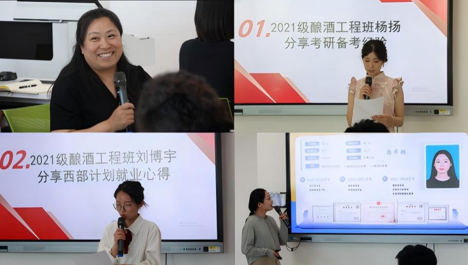 2021级酿酒工程班主任王芳深情回顾了大学四年每一位同学的成长与奋斗以及班级加强学风建设的情况,杨扬同学聚焦“时间管理 + 心态调节”,分享了考研备考的经验。即将奔赴西部的刘博宇同学分享了她“到祖国需要的地方去”的初心,诠释了青年学子的责任担当,彰显了北农学子的奉献精神。国家奖学金获得者、2022级酿酒工程班的郭芊钰同学以“发酵你的时间”为题,结合所学专业,从三段时间酿造法、能量四象限沙漏等方面分享了如何让每一分钟都酿出醇香人生的高效成长秘笈,为低年级学生提供了宝贵经验。