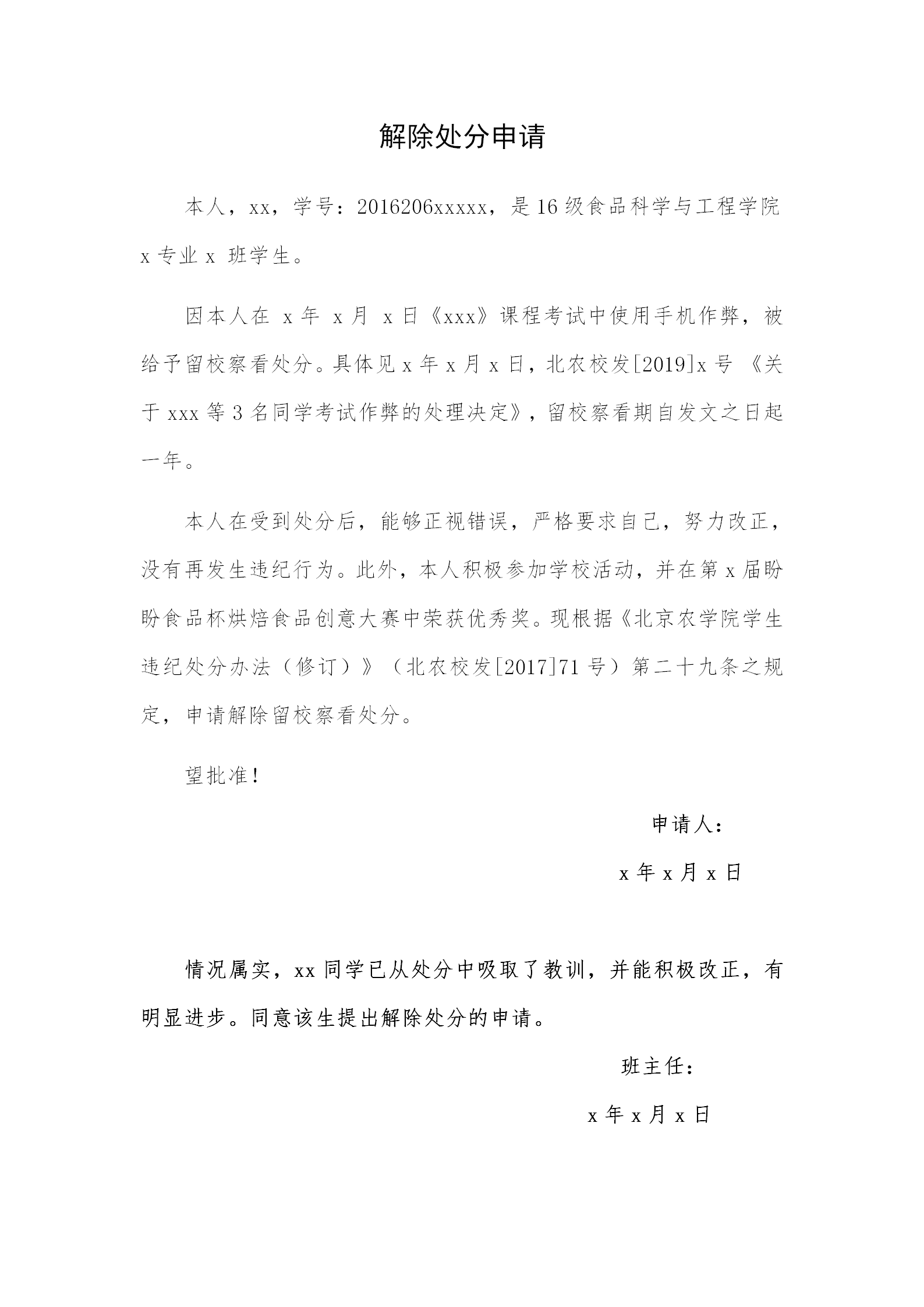 按williamhill中国要求,每年5月和12月,处分期结束的同学,可申请解除处分。模板格式如图示,请结合自己的实际情况替换、补充内容。申请需手写,注意字迹工整,写好之后,找班主任老师手写签署是否同意申请的意见。意见签署后,后交辅导员(学生做到这一步就可以了,剩下辅导员老师办),由辅导员交学院党政联席会讨论,形成决议,决议送到学生处,等学校开会决定是否解除,如同意解除,会再发解除处分文件。学校送档案室1份、给学院2份,其中1份转交学生本人签收。
