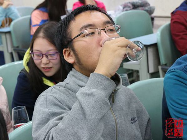 “在3000到6000年前,有位希腊神将制造葡萄酒的方法授予人类......”李昊学长从葡萄酒的起源说起,将葡萄酒的传说、种类、著名酒庄等娓娓道来,让同学们深入了解了葡萄酒文化。