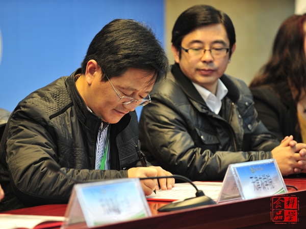 在京津冀高校大学生食品人的诚信联盟成立签约仪式中,8位院校代表进行签字并合影留念。