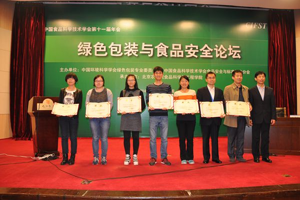 在本次大会上,绿包委秘书长仝其根教授还为获得优秀论文奖和绿色包装设计奖的七位教师和同学代表颁发了获奖证书,其中来自天津科技大学的汤佳敏同学及指导教师孙彬青老师获得了绿色包装设计大赛的一等奖。