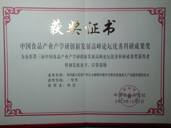 本次论坛由北京食品科学研究院和中国食品杂志社联合主办,会上对突出贡献的高校、科研院所、企业,杰出科研人才,杰出企业家,优秀科研成果进行了表彰。食品学院刘慧教授主持的《利用藏灵菇源产胆盐水解酶和胞外多糖的乳酸菌生产功能性酸奶技术》获得优秀科研成果二等奖。