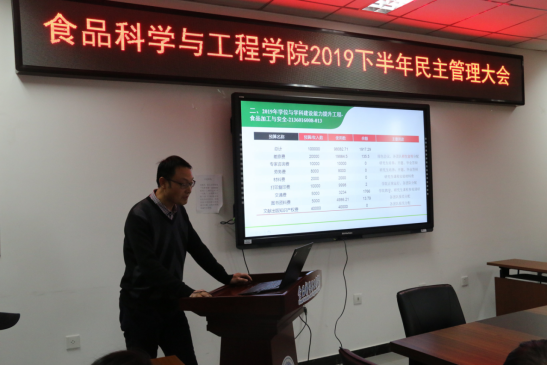 党委常委、副校长段留生认真听取了报告和总结,对学院在2019年党代会筹备、本科教学工作审核评估、世园会展示保障、国庆庆祝活动、一流专业建设等重要工作中取得的成绩表示肯定和祝贺,对2020年工作重点提出了建议和希望。他指出,学院要结合国家发展大趋势,围绕食品安全、人才培养、科技创新和技术服务,突出学院特色,集思广益,谋篇布局,争取在2020年完成CMA/CNAS双认证实验室的建设工作。他强调,食品作为新兴学科,基础和应用研究均有广阔的发展前景,鼓励老师们抓住机会,乘势而上,积极申报国家和省部级科研项目,推动个人和学院发展。