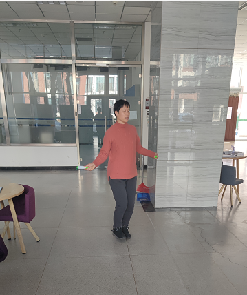 为方便会员们参与,分工会安排了专人带着跳绳、在会员们午饭必经之路食品楼一层大厅等候。跳绳采用单摇单跳,计时两分钟。会员们或独自到场参加,或约上办公室同事一起参加。有跳绳的,有数数的,有鼓掌加油的,还有一起跳着比赛的,为大厅增添了生气,其乐融融。