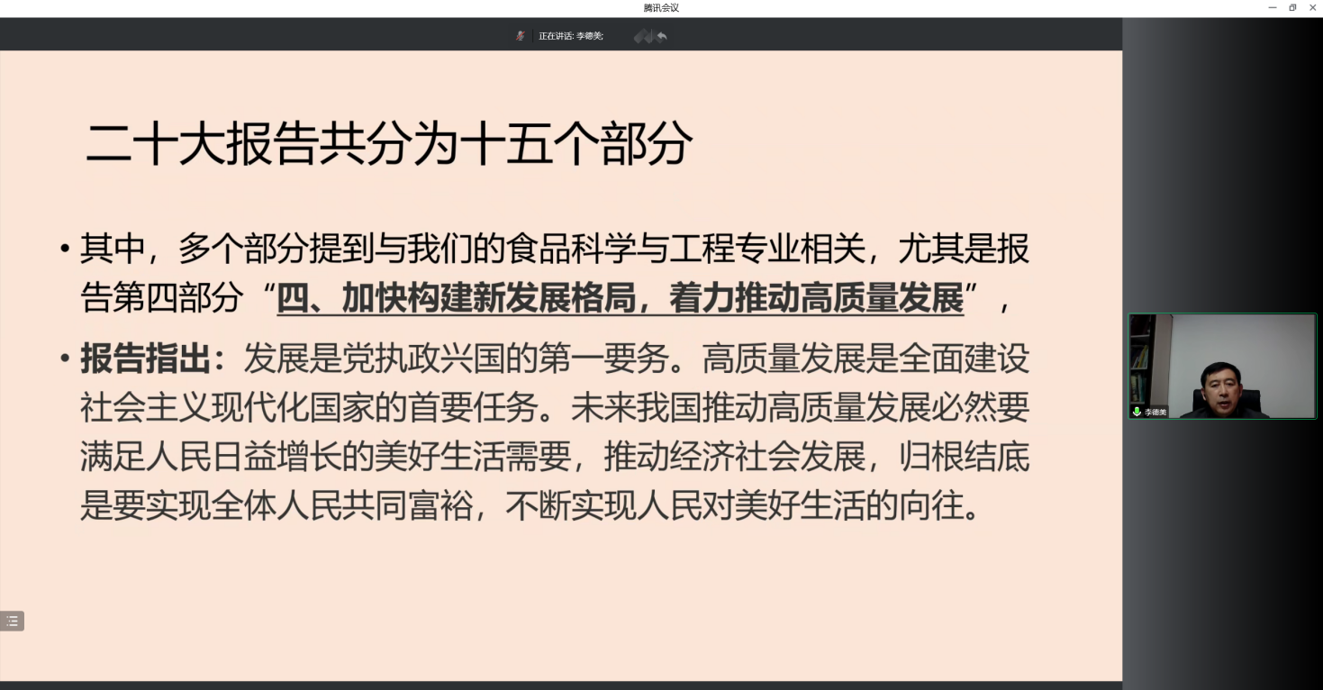 学校学习贯彻党的二十大精神宣讲团成员、酿酒工程系主任李德美作题为“立足本职,精修专业,为推进乡村振兴立新功”主题宣讲。李德美指出,党的二十大报告就“加快构建新发展格局,着力推动高质量发展”作出重要部署。他立足自身多年从事葡萄与葡萄酒工程领域教学、科研与社会服务经历,从服务葡萄酒产业发展,助力国家粮食供应安全、乡村振兴、推进兴边富民稳边固边、推进高水平对外开放和“一带一路”国家战略五个方面进行重点讲解。