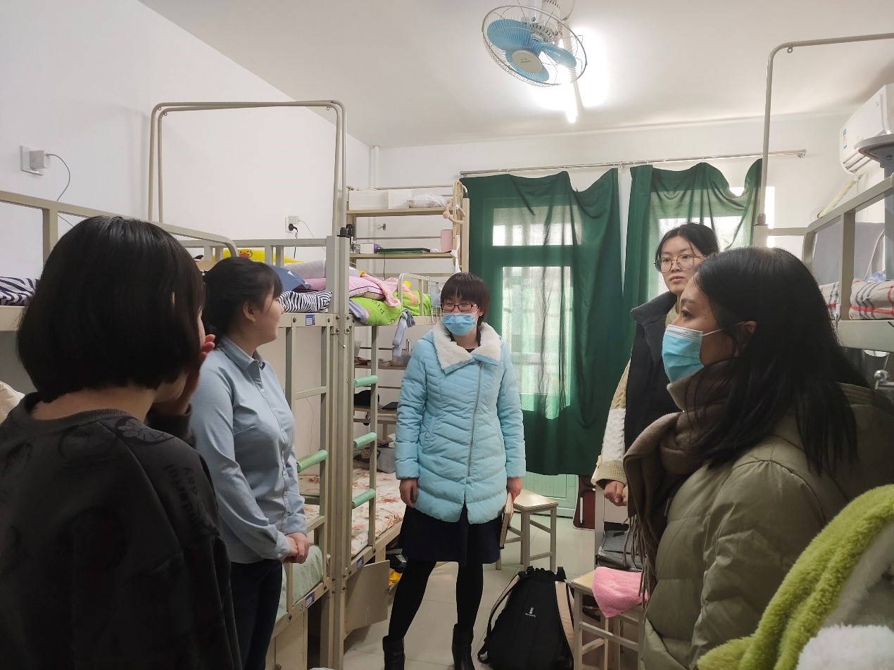 2月19日下午,WilliamHill中文党总支副书记、副院长王雪,副院长丁轲,班主任王昊然、辅导员任墨诺和两名班主任助理分别到学生公寓7号楼和9号楼抽查了卫生和安全工作,特别看望了因疫情延误,首次到校的6名学生。
