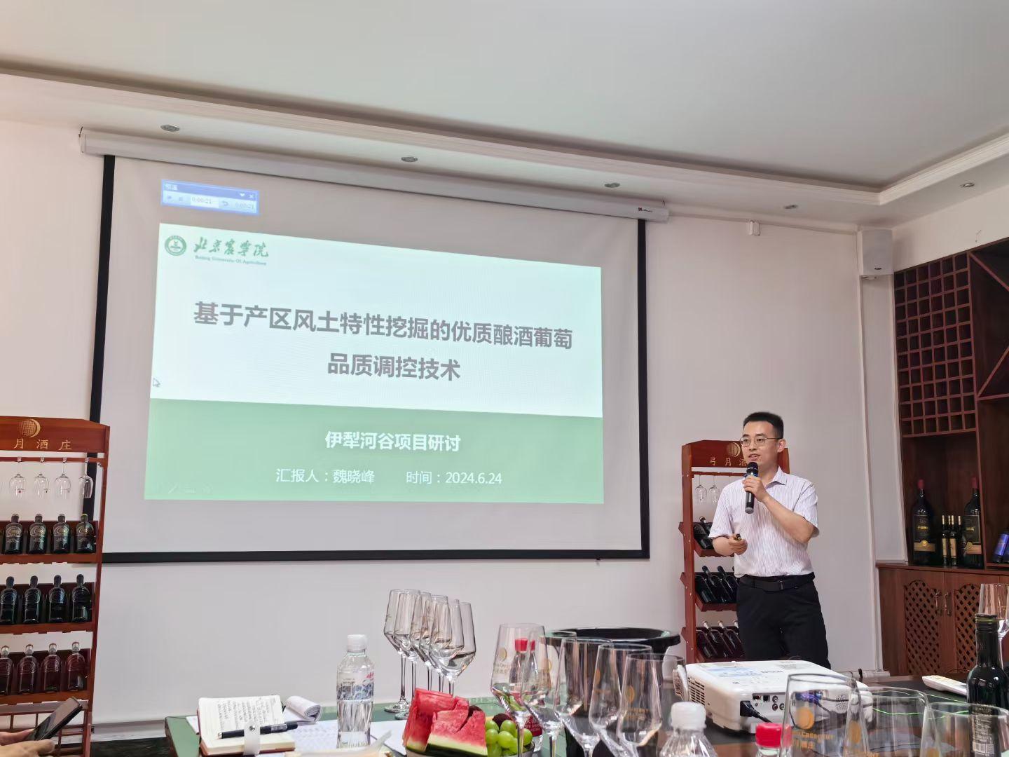 魏晓峰作了题为“基于产区风土特性挖掘的优质酿酒葡萄品质调控技术”的报告,报告对“产区风土”的含义、意义及表达方式进行了深入分析,从树形、修剪、叶幕、果际微环境、土壤、水肥等方面对优质酿酒葡萄品质调控技术进行了案例展示,对由我校研究团队承担的“伊犁河谷产区葡萄酒中关键物质测定及分析”进行了项目回顾及未来展望。