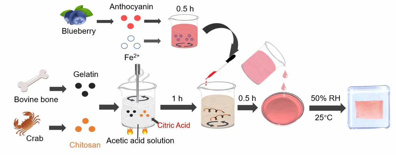 该研究通过交联聚合反应和多种表征技术深入探究了花青素-Fe²⁺螯合物在明胶/壳聚糖基质中的稳定性和颜色响应特性,使用天然pH指示剂(花色苷)制备的智能膜对氨气和pH值具有高敏感性。通过冷鲜猪肉保鲜实验,验证了该智能薄膜能够通过指示膜的颜色变化有效监测肉类在贮存中的腐败程度,实现在不打开包装的情况下,直观判断肉的品质,为监测冷鲜猪肉的新鲜度提供了一种创新解决方案。