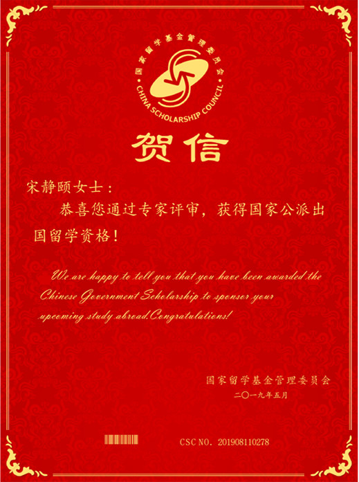 我院食品科学专业硕士研究生宋静颐同学,于近日喜获国家公派出国留学资格,即将赴荷兰瓦赫宁根大学攻读博士学位,她继2018年刘静媛同学获国家公派出国留学资格之后再次为学院增光添彩。